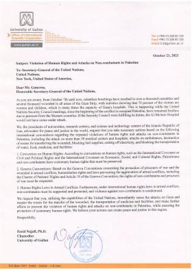The chancellor of the University of Guilan’s letters to his foreign counterparts and the Secretary General of the United Nations in support of the people of Gaza